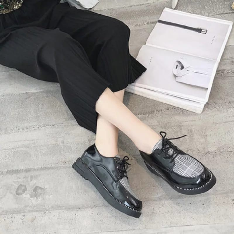 Produsen Sepatu W di Kabupaten Sampang Sepatu Wanita Premium Tali Kasual Style Korea / Sepatu Black Glosy Variasi Kotak 099 dari Fakhrieshop Kab. Bandung