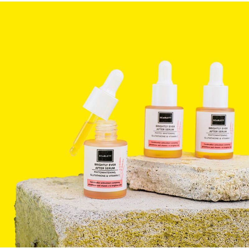 SCARLETT WHITENING BRIGHTLY EVER AFTER SERUM WAJAH SCARLETT WHITENING 15ml100% originalDi dalam Brightly Ever After Serum terdapat kandungan Phyto Whitening, Glutathione, Vitamin C, Niacinamide dan Lavender Water yang dimana bermanfaat sebagai :1. Membantu mencerahkan kulit dan memudarkan noda di wajah seperti hiperpigmentasi, bekas jerawat, flek dan bekas luka.2. Membantu mengontrol kadar minyak berlebih di kulit, membantu mengeceilkan pori-pori, mengimprovisasi warna kulit, menghaluskan kerutan dan juga garis di kulit.3. Membantu menutrisi dan melembabkan kulit.4. Membantu membuat kulit menjadi lebih relax dan calm.5. Bekerja sebagai antioxidant dan juga sebagai anti pollution.- Cara Pakai :Teteskan 2-3 tetes serum, usap dan pijat secara perlahan sampai merata pada kulit wajah. Diamkan beberapa saat agar serum meresap ke k